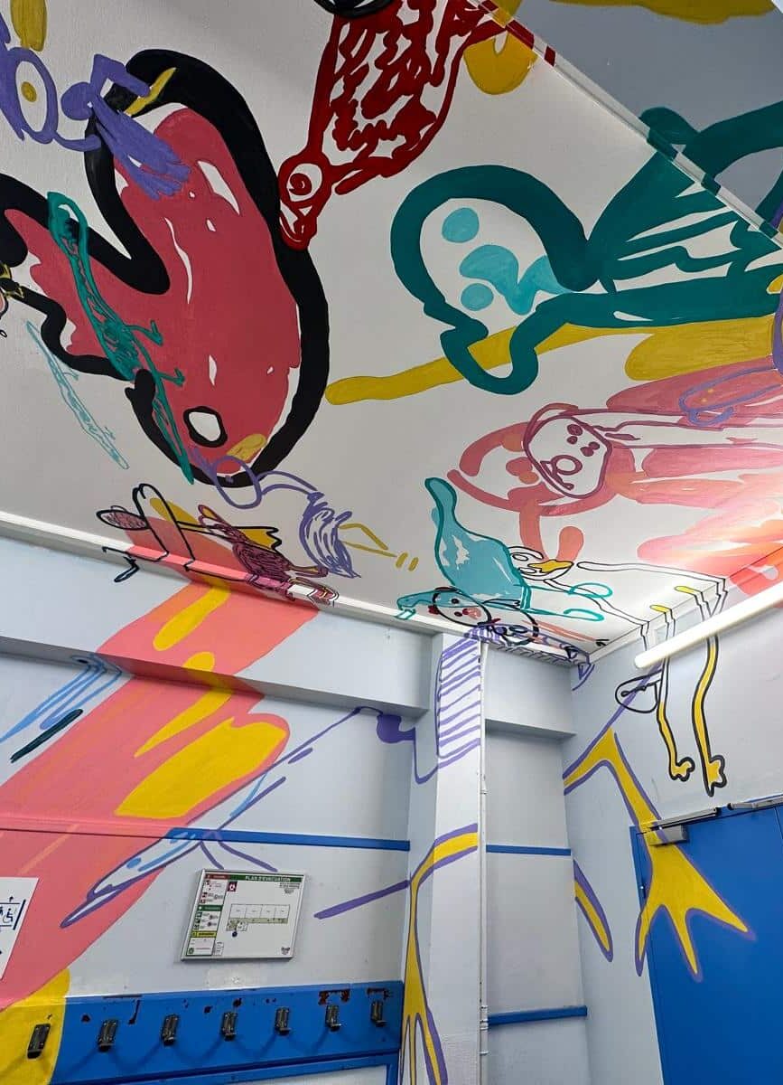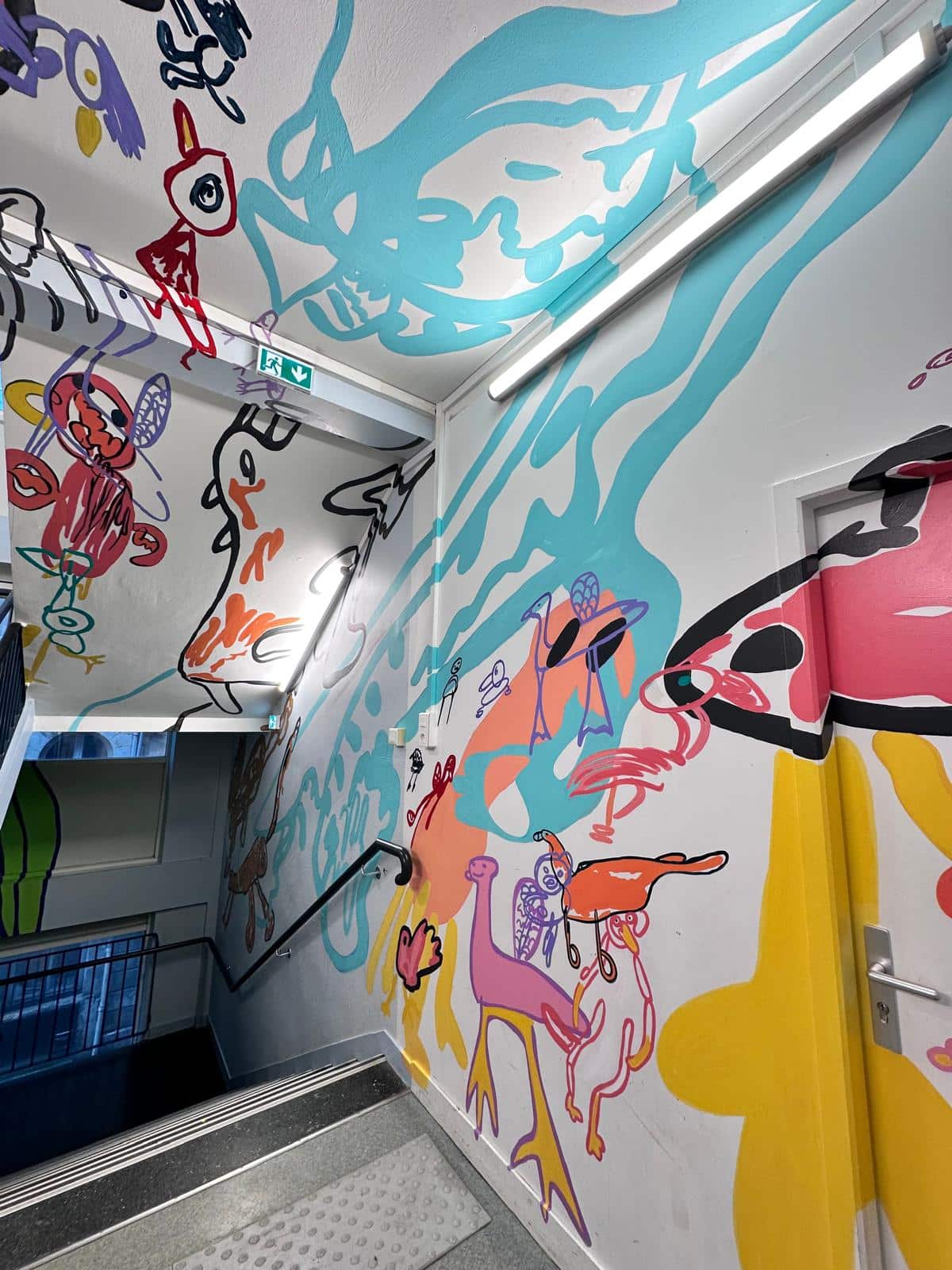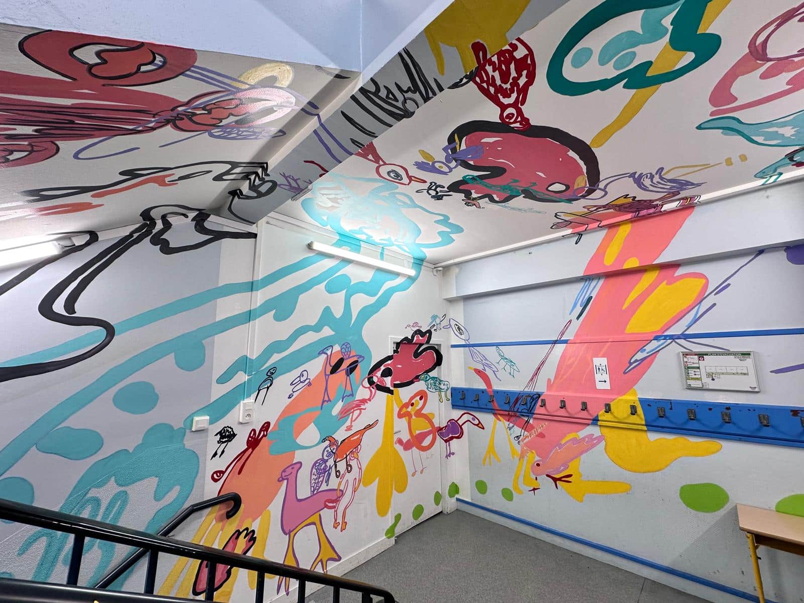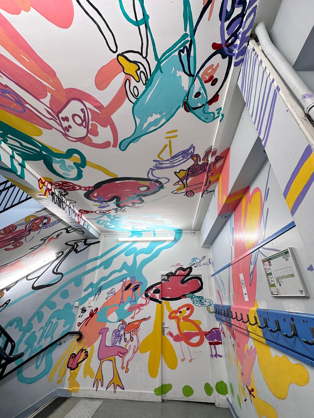 La fresque, quant à elle, est composée d’animaux et de créatures réalisés pendant l’année, et recouvre les couloirs de l’école du Vieux-Bordeaux à la manière d’une anamorphose. Les peintures commencent sur un mur et se terminent sur un plafond, faisant travailler notre perception sur notre environnement. Elles requièrent un effort d’ajustement du regard et de positionnement de notre corps, pour pouvoir recomposer une forme dans son intégralité.