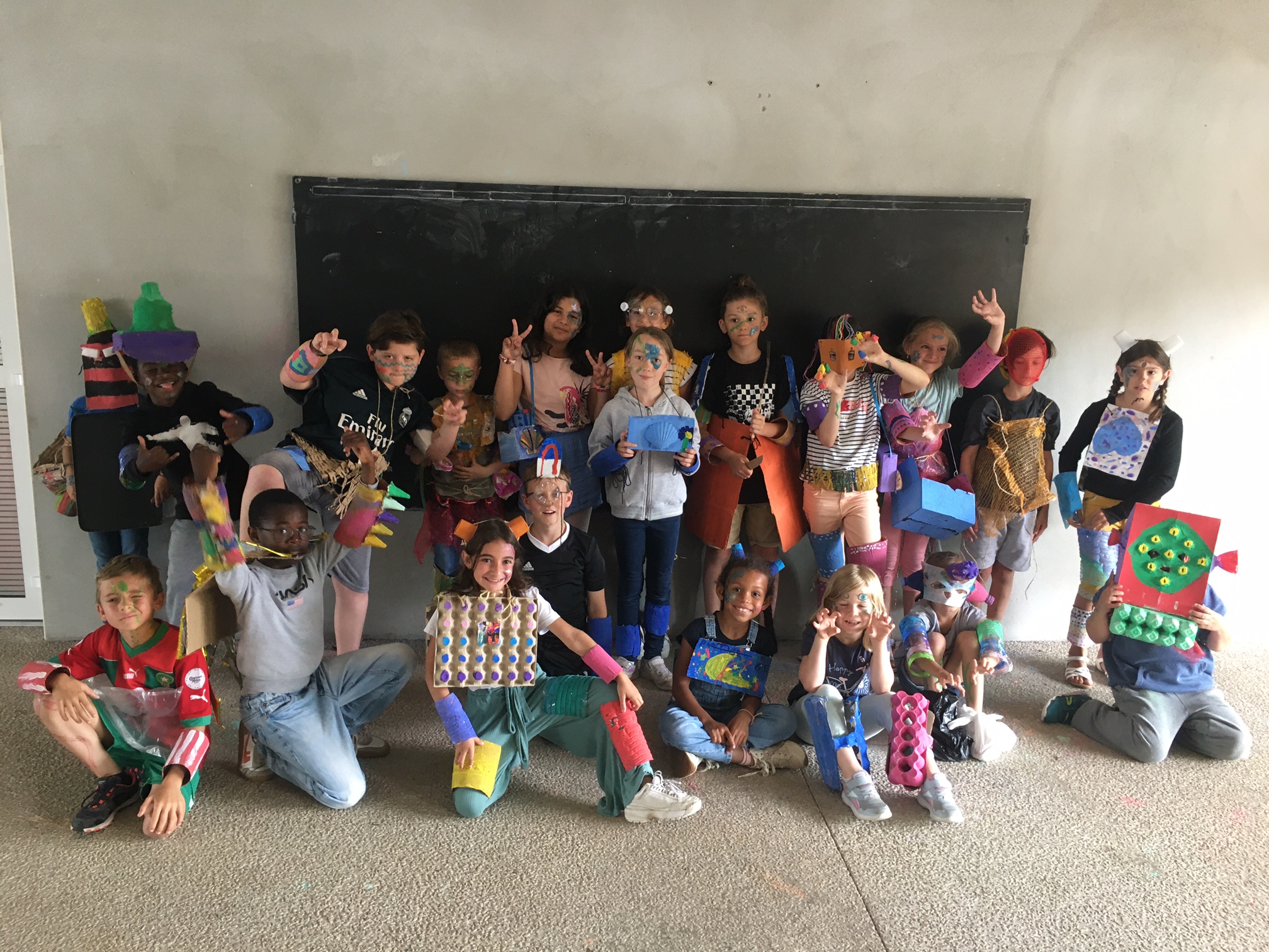 Aux cotés de l’artiste Camille Benbournane, les enfants ont été amenés·es à réfléchir au « monde d’après » et aux populations nouvelles qui le peuple. Par l’imaginaire et la confection de costumes, les élèves ont écrit une nouvelle histoire de leur commune.
